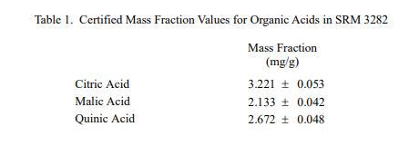 測定有機(jī)酸的分析方法:SRM 3282 中有機(jī)酸質(zhì)量分?jǐn)?shù)的賦值是基于 NIST 使用液相色譜法和吸光度檢測(LC-吸光度)和離子色譜法和電導(dǎo)檢測(IC-CD)提供的結(jié)果的組合)。
