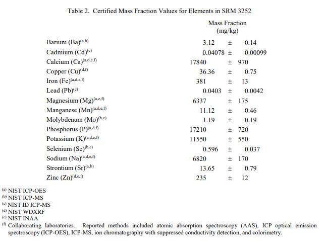 表 1 至表 3 中提供了NIST SRM 3252蛋白質(zhì)飲料混合物中膽固醇、元素和維生素的認(rèn)證質(zhì)量分?jǐn)?shù)值,以干質(zhì)量為基礎(chǔ)報(bào)告。NIST 認(rèn)證值是 NIST 認(rèn)證的值對(duì)其準(zhǔn)確性的信心最高,因?yàn)樗幸阎蚩梢傻钠詈涂勺冃詠?lái)源都已考慮在內(nèi) [1]。價(jià)值分配分析由 NIST 和合作實(shí)驗(yàn)室進(jìn)行。認(rèn)證值計(jì)算為 NIST 方法的平均值和合作實(shí)驗(yàn)室提供的平均結(jié)果的中位數(shù)(在適當(dāng)?shù)那闆r下)。相關(guān)的不確定性以大約 95% 的置信水平表示 [2-4]。