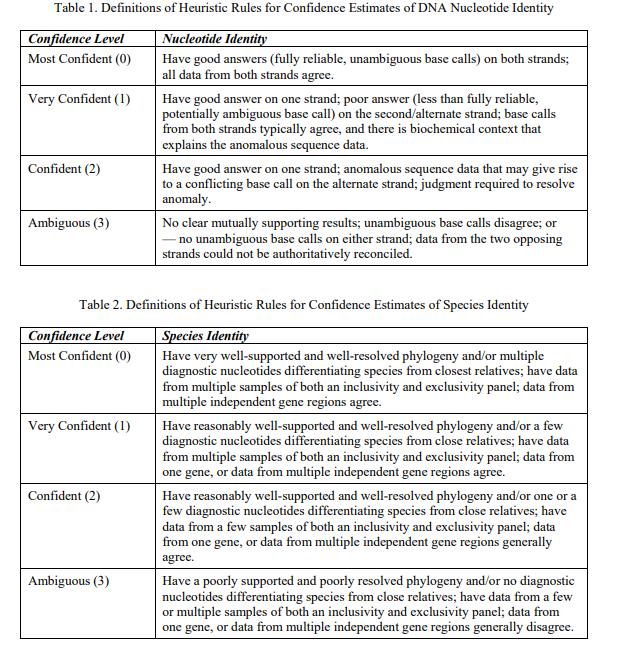 NIST SRM 3246銀杏葉(葉子)經(jīng)認證的物種鑒定是銀杏,來自 psbA-trnH 基因間間隔區(qū)和 trnL 內(nèi)含子區(qū)域的相關(guān)葉綠體 DNA 序列可在伴隨的 FASTA 格式文件中獲得 [1]。與序列中每個核苷酸相關(guān)的不確定性,以及與作為物種標識符的 DNA 序列相關(guān)的不確定性,以表示對規(guī)定值的信念強度的序數(shù)尺度表示(0 = 最有信心,1 = 非常有信心,2 = 有信心,3 = 模棱兩可)(表 1 和表 2)[2]。