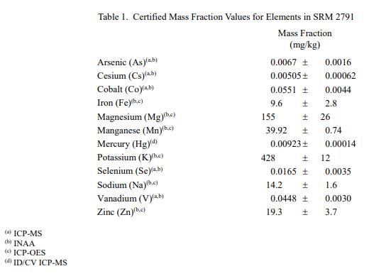 表 1 提供了 SRM 2791 中元素的認(rèn)證質(zhì)量分?jǐn)?shù)值,以干質(zhì)量為基礎(chǔ)報告。NIST 認(rèn)證值是 NIST 對其準(zhǔn)確性有最高置信度的值,在所有已知的或懷疑的偏倚來源已被調(diào)查或考慮[1]。 NIST 進(jìn)行了賦值分析。元素的認(rèn)證質(zhì)量分?jǐn)?shù)值計算為平均值