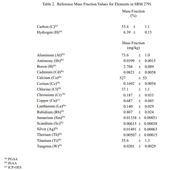 表 2 和表 3 中提供了其他元素的參考質(zhì)量分?jǐn)?shù)值,以干質(zhì)量為基礎(chǔ)報告,以及 SRM 2791 中的灰分。NIST 參考質(zhì)量分?jǐn)?shù)值是最佳估計值的非認(rèn)證值基于可用數(shù)據(jù)的真實值;但是,這些值不符合 NIST認(rèn)證標(biāo)準(zhǔn) [1] 提供的不確定度可能僅反映測量再現(xiàn)性,可能不包括所有不確定性來源,或者可能反映多種分析方法之間缺乏足夠的統(tǒng)計一致性。參考質(zhì)量分?jǐn)?shù)值來自 NIST 報告的結(jié)果。