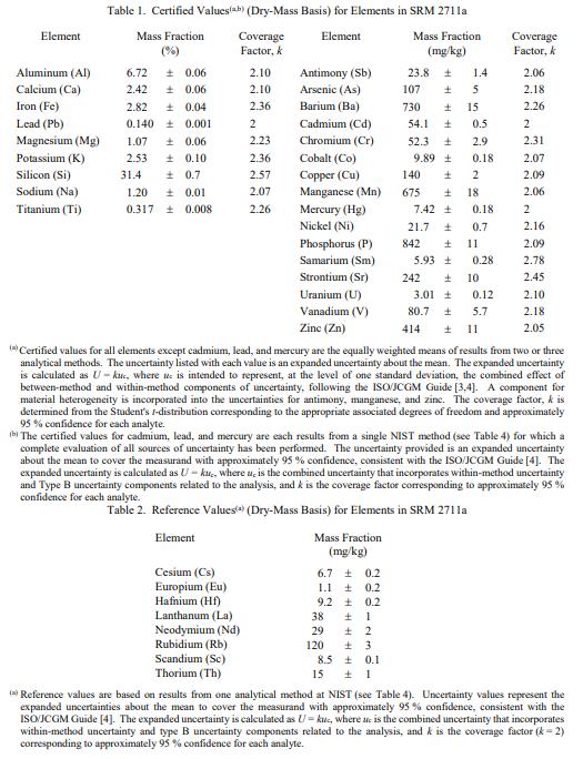 表 1 中提供了元素的認(rèn)證濃度,以基于干質(zhì)量的質(zhì)量分?jǐn)?shù) [1] 表示。認(rèn)證值基于通過嚴(yán)格評(píng)估的獨(dú)立分析技術(shù)獲得的結(jié)果。 NIST 認(rèn)證值是 NIST 對(duì)其準(zhǔn)確性具有最高置信度的值,因?yàn)樗幸阎蚩梢傻钠顏碓炊家驯徽{(diào)查或考慮在內(nèi) [2]。被測(cè)量是表 1 中報(bào)告的元素的總濃度。計(jì)量溯源性為 SI 質(zhì)量單位,表示為導(dǎo)出的質(zhì)量分?jǐn)?shù)單位。