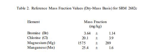 表 2 中提供了溴、氯、鎂和錳的參考值,以基于干質(zhì)量的質(zhì)量分?jǐn)?shù) [1] 表示。參考值是最佳估計值的非認(rèn)證值的真實價值;但是,該值不符合 NIST 的認(rèn)證標(biāo)準(zhǔn),并且提供了相關(guān)的不確定性,該不確定性可能僅反映測量精度,可能不包括所有不確定性來源 [2]。