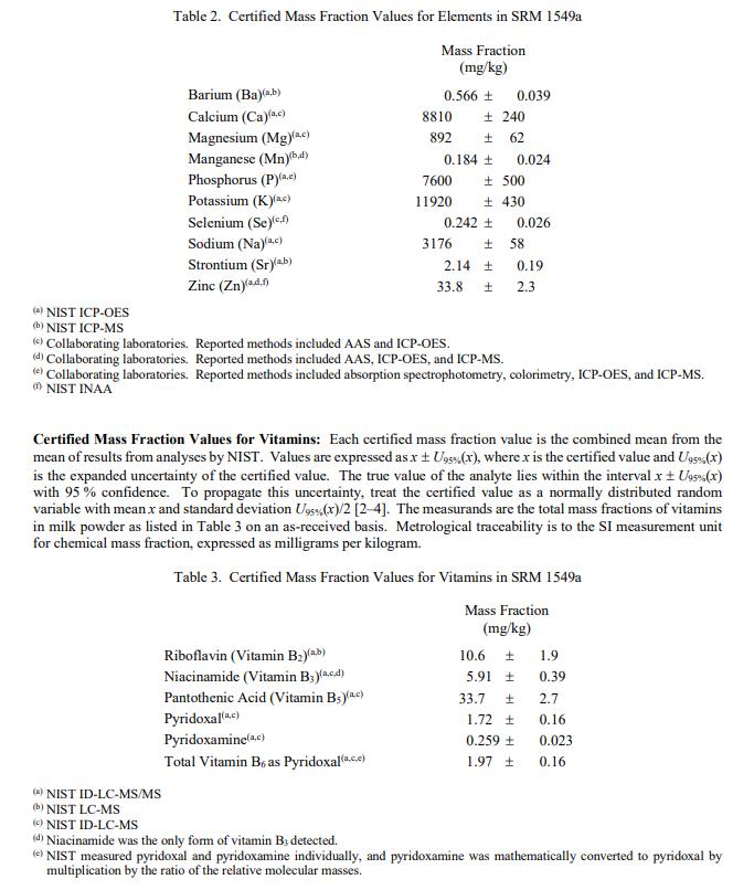 表 1 至表 3 提供了 SRM 1549a 中膽固.醇、元素和維生素的認(rèn)證質(zhì)量分?jǐn)?shù)值(按原樣報(bào)告)。 NIST 認(rèn)證值是 NIST 具有最高置信度的值在其準(zhǔn)確性方面,所有已知或可疑的偏見來(lái)源都已被考慮到[1]。 NIST 和合作實(shí)驗(yàn)室對(duì)價(jià)值分配進(jìn)行了分析。認(rèn)證值計(jì)算為 NIST 方法的平均值和合作實(shí)驗(yàn)室提供的平均結(jié)果的中位數(shù)(在適當(dāng)?shù)那闆r下)。相關(guān)的不確定性以大約 95% 的置信水平表示 [2-4]。