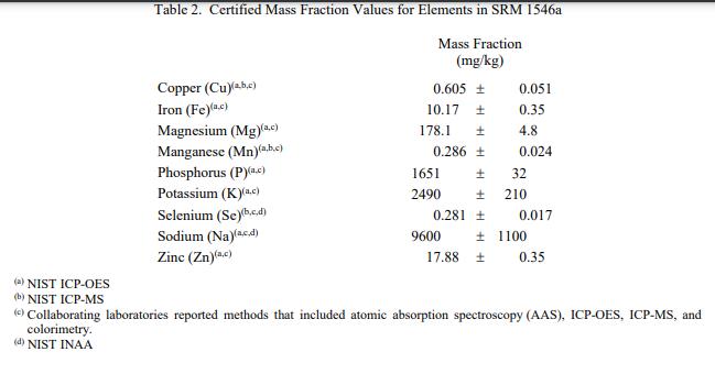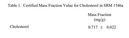 表 1 至表 3 提供了 SRM 1546a 中膽固醇、元素和維生素的認(rèn)證質(zhì)量分?jǐn)?shù)值(按原樣報告)。 NIST 認(rèn)證值是 NIST 具有最高置信度的值在其準(zhǔn)確性方面,所有已知或可疑的偏見來源都已被考慮到[1]。價值分配分析由 NIST 和合作實驗室進(jìn)行。認(rèn)證值計算為 NIST 方法的平均值和合作實驗室提供的結(jié)果平均值的中位數(shù)或平均值(如果適用)。相關(guān)的不確定性以 95% 的置信水平表示 [2-4]。