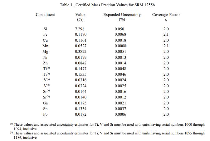 NIST SRM 1255b - 鋁合金356(圓盤形) 中成分的認(rèn)證值列在表 1 中,作為鋁基體中元素總量的質(zhì)量分?jǐn)?shù) [1]。 NIST 認(rèn)證值是 NIST 對(duì)其準(zhǔn)確性有最高置信度的值,因?yàn)樗幸阎蚩梢傻钠顏?lái)源都已考慮在內(nèi)。認(rèn)證值是對(duì)真實(shí)值的當(dāng)前最佳估計(jì)。認(rèn)證值在計(jì)量上可追溯至以百分比表示的 SI 派生的質(zhì)量分?jǐn)?shù)單位。每個(gè)規(guī)定的值是來(lái)自多個(gè)實(shí)驗(yàn)室的三種分析方法的結(jié)果的未加權(quán)平均值。隨數(shù)值列出的不確定度是擴(kuò)展的不確定度,使用列出的覆蓋因子 [3-5] 以大約 95% 的覆蓋率表示。
