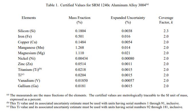 NIST SRM  1240c 鋁合金3004 (標(biāo)準(zhǔn)品) 的認(rèn)證在規(guī)定的測量不確定度內(nèi)無限期有效,前提是按照本證書中的說明處理和存儲 SRM(參見“使用說明”)。因此,不需要定期重新認(rèn)證此 SRM。該認(rèn)證將是如果 SRM 被損壞、污染或以其他方式修改,則無效。